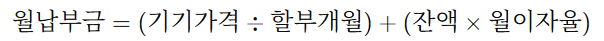 - 예: 120만 원 기기, 12개월 할부, 월 이자율 1% → 매월 납부금은 원금 + 잔액 이자 포함